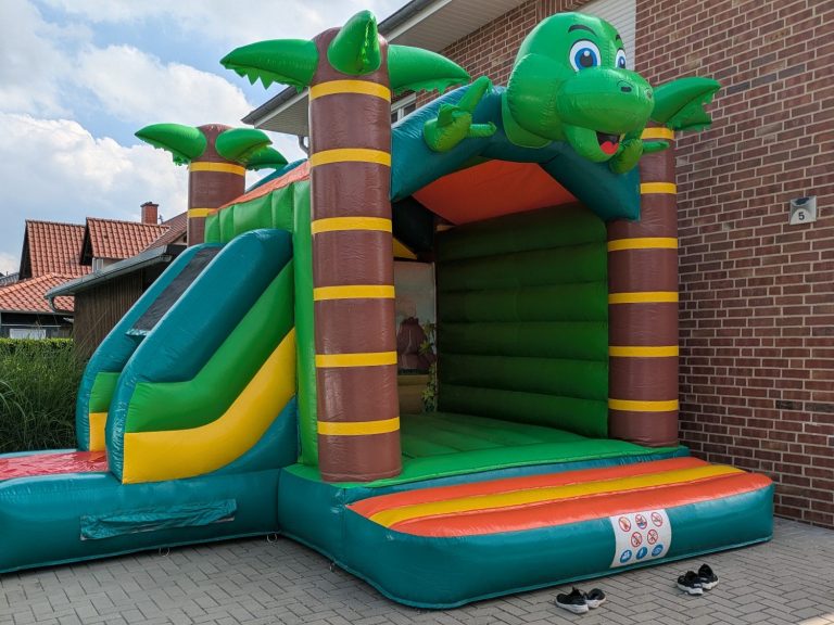 Besondere Merkmale:Design: Bunte, kinder gerechte Gestaltung mit einem lustigen Dino-Motiv, das die Fantasie anregt und zum Spielen einlädt.Dach: Die Hüpfburg ist mit einem robusten Dach ausgestattet, das vor starker Sonne schützt und den Kindern auch bei heißem Wetter ein angenehmes Spielerlebnis ermöglicht als besonders Highlight ist hier die seitliche Rutsche hervor zu heben.Größe: Perfekt dimensioniert, um mehrere Kinder gleichzeitig Platz zum Hüpfen zu bieten, ohne zu viel Platz zu beanspruchen.Sicherheit: Hochwertiges Material, stabile Nähte und rutschfeste Böden sorgen für ein sicheres Spielvergnügen. Schneller Auf- und Abbau, Ideal für KindergeburtstageSchul- und KindergartenfesteStadtfeste und FestivalsFirmen-Events mit KinderprogrammMiete unsere "Lustiger Dino" Hüpfburg und bereite den kleinen Gästen eine riesige Portion Spaß – geschützt durch das praktische Dach, das vor Sonne schützt